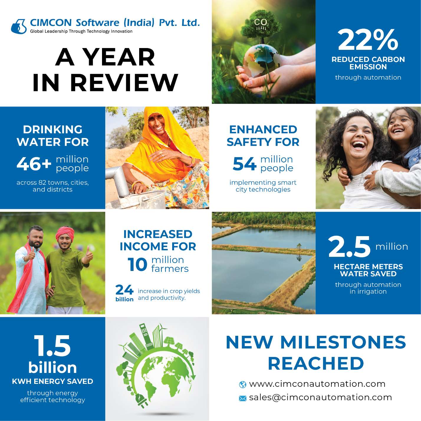 At its core, CIMCON is helping the urban and rural populations of India to address their most pressing challenges. For urban India, civilians are searching for ways to improve safety and implement modern infrastructure throughout cities. For rural India, the challenge encompasses attaining clean drinking water in villages and sufficient supply of water for farming. 60-70% of India’s population still depends on agriculture for their livelihood, and CIMCON canal automation solutions ensure that farmers get the necessary water for their crops to thrive. CIMCON’s solutions have increased income for 10 million farmers, with a ₹ 24 billion increase in crop yields and productivity.