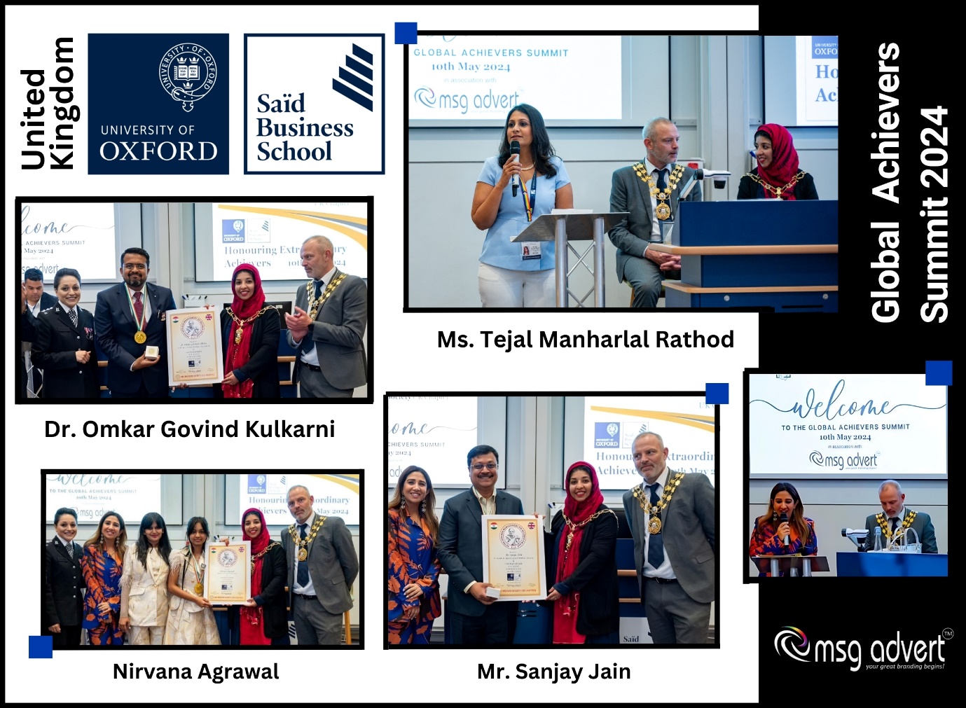 Msg Advert Pvt Ltd proudly hosted its 52nd edition of The International Summit & Awards on 10th May 2024 at the prestigious Said Business School, Oxford University, United Kingdom. The event was graced by an illustrious lineup of chief guests, including H.E. Alain St. Ange, Eminent Leader of Seychelles; Lubna Arshad, Lord Mayor of Oxford; Ms. Camila Pinzon, Miss World Colombia; Dr. Graziella Thake, CEO of Optimisation Hub and International Speaker; and Mr. Mark Lygo, Sheriff of Oxford. The chief guests were honored by Mr. Nitish Arora and Ms. Gaganeet Kaur, Directors of Msg Advert Pvt Ltd.