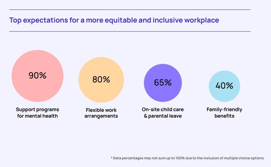 Work-Life Balance: 90% seek access to mental health resources, while 80% value flexible work arrangements and family-friendly policies.
